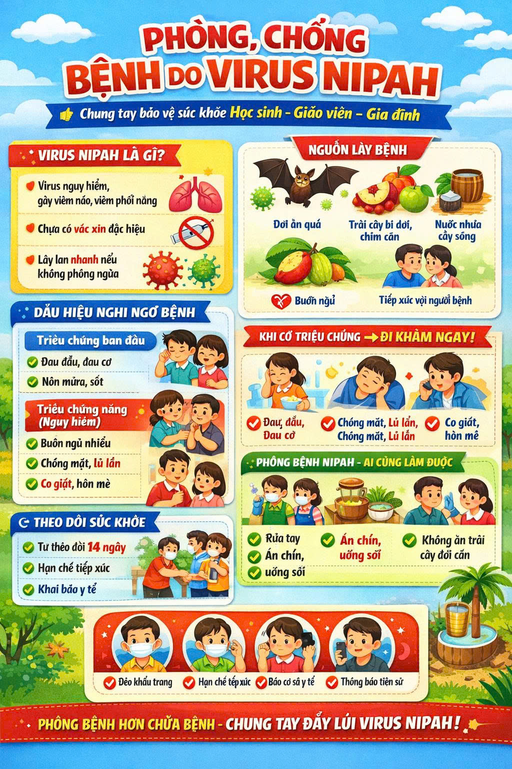 Đồng thời, đảm bảo vệ sinh thực phẩm, thực hiện “ăn chín, uống sôi”, rửa sạch và gọt vỏ trái cây trước khi ăn, không ăn, uống các loại trái cây có dấu hiệu bị động vật (dơi, chim) cắn hoặc gặm nhấm; tránh uống nước nhựa cây (như nhựa cây thốt nốt, nhựa dừa sống hoặc chưa qua chế biến).